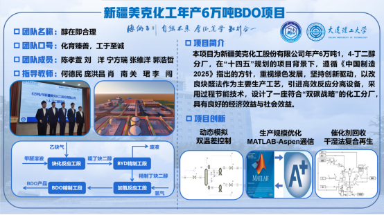 “醇在即合理”团队以乙炔、甲醛和氢气为原料,通过绿色先进的改良炔醛法工艺生产6万吨1,4-丁二醇产品,对项目进行市场调研、厂址选择、可行性论证、工艺路线比选、工艺流程确定、流程模拟、设备设计与选型、自动控制、工厂与车间平立面布置、安全评价、环境评价、经济分析、清洁生产等几大模块进行可行的工艺和工程设计,使技术提升达到“中国制造2025”中提出的低碳绿色发展指标,利用三维建模软件对作品进行多维度展示,具有“安全、环保、节能、创新、经济、可靠、实用”的特色。该设计作品体现了新时代大学生对当前化工材料行业面临限塑令背景,对可降解塑料机遇给予独特的思考。为当前同时面对“安全环保”与“双碳”目标制约下产品1,4-丁二醇绿色低碳发展提供了一种新的思路和解决方案。