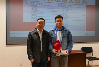 为激励班级同刻苦学习、积极进取,班级设立学年学习优秀奖和学业进步奖。郭新闻教授为上一学年学习成绩优异的6名同学和学业进步显著的9名同学颁发奖状和奖品,以资鼓励。