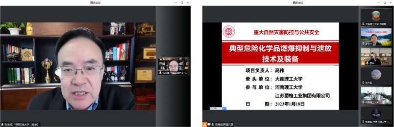 1月18日,由大连理工大学牵头,河南理工大学、江苏爵格工业集团有限公司参与承担的国家“十四五”重点研发计划“重大自然灾害防控与公共安全”重点专项项目“典型危险化学品燃爆抑制与泄放技术及装备”启动暨实施方案论证会在线上召开。由中国石油大学(北京)张来斌院士担任组长的评审组,中国21世纪议程管理中心项目主管彭雪婷、教育部科技司项目主管田镇豪、大连理工大学化工学院院长彭孝军院士、科学技术研究院院长王博、副院长蒋成刚、北京紫恒星会计师事务所有限公司高级会计师董威,以及项目成员单位的相关专家学者参加会议。开幕式由科学技术研究院副院长蒋成刚主持。