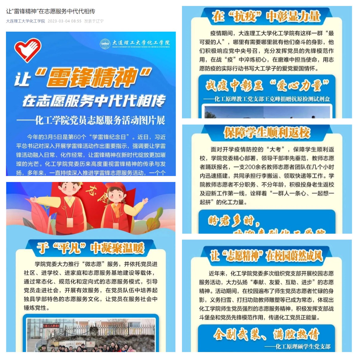 多年来,学院党委一直持续深入推进学雷锋志愿服务活动,一个个志愿者如一颗传播雷锋精神的种子,将志愿精神播撒、厚植在化工学院的每一个角落。精心制作党员志愿服务活动图片展,以微信推送为媒介,在学院微信公众号发布党员志愿服务活动图片展,一张张图片、一串串回忆,化工学院的师生们用实际行动践行雷锋精神,让“永不生锈的螺丝钉”精神绽放新时代光辉。