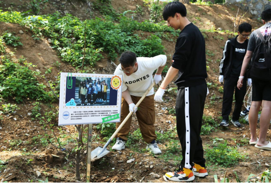 各班代表协作有力,拔草、松土、浇水,并在小树旁边立起了带有各班简介与合照的事迹牌。同学们也在小卡片上写下了对于大学四年的点滴回忆和对未来生活的憧憬期许,系于树枝上,随风飘扬。