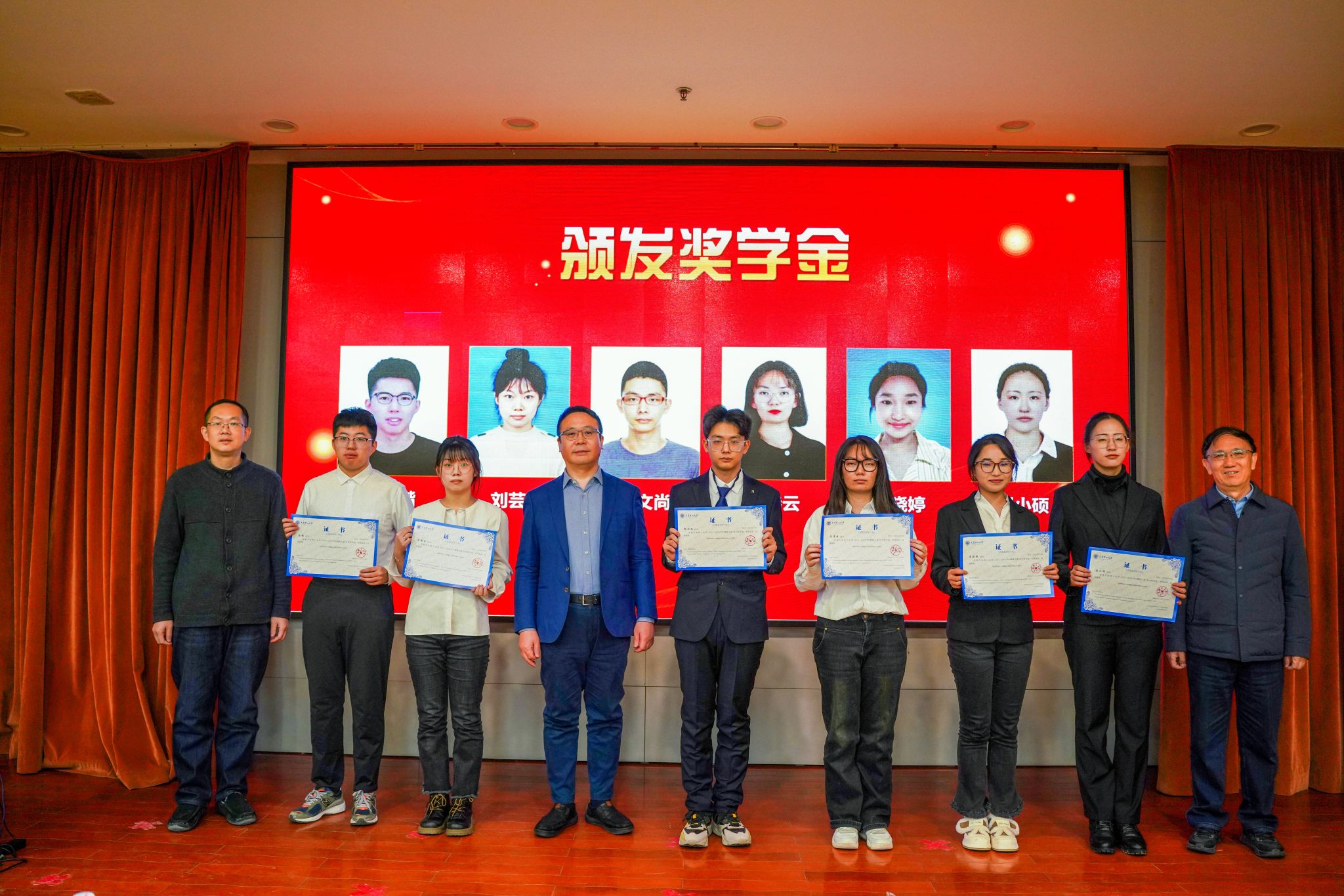 在颁奖仪式上,韦建树、毕明树、高伟为获奖学子化安2020级马锴、刘芸菲,化安2021级郭文尚、乔诗云,化安2022级马晓婷、刘小硕颁奖。