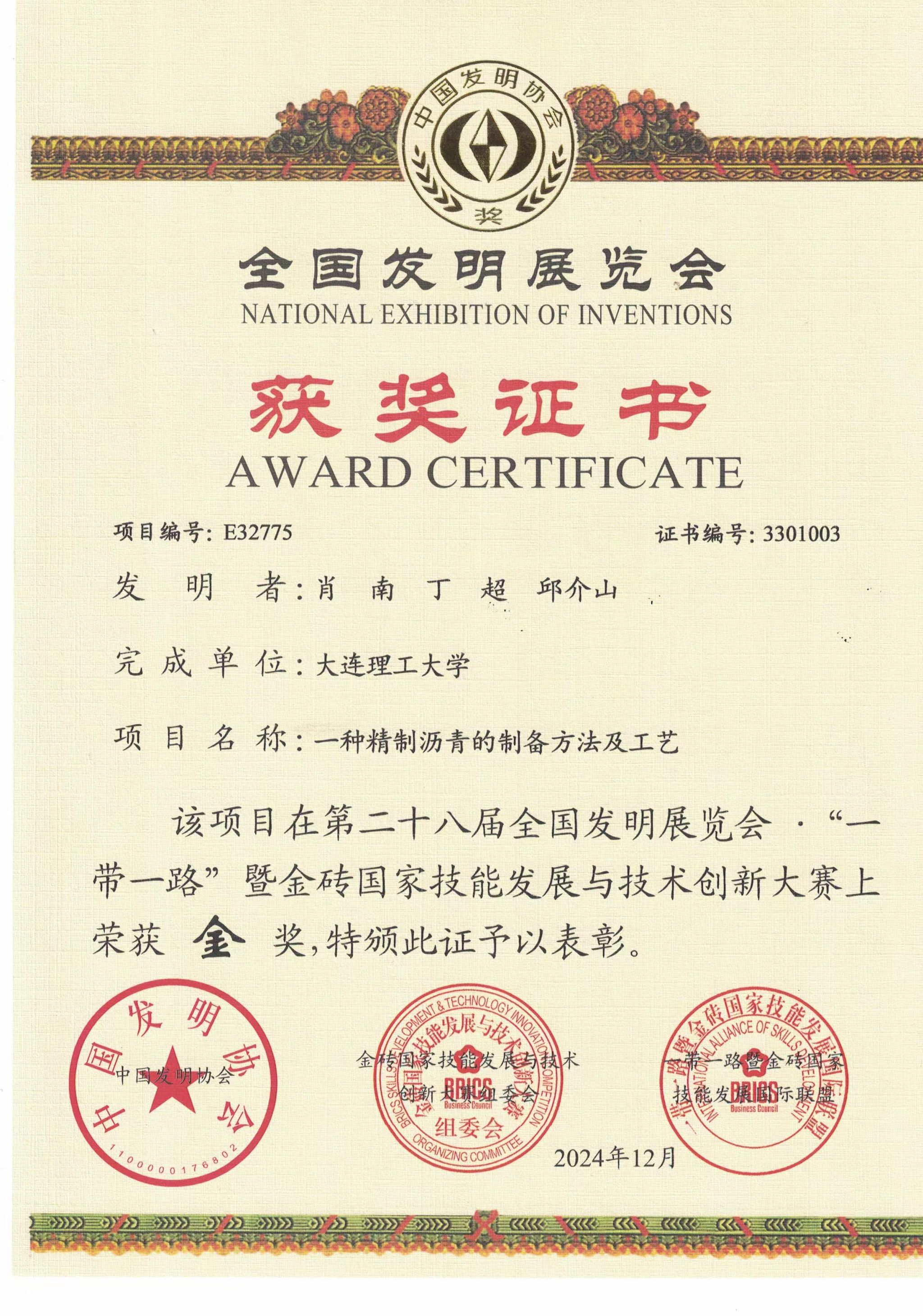 近日,第二十八届全国发明展览会·“一带一路”暨金砖国家技能发展与技术创新大赛落下帷幕。化工学院3个项目全部获奖。肖武副教授、贺高红教授等发明的“一种焦炉煤气膜分离、蒸汽重整、变压吸附联用制氢方法”、肖南副教授等发明的“一种精制沥青的制备方法及工艺”获得金奖;姜晓滨教授、贺高红教授等发明的“多功能膜调控结晶科研仪器”获得银奖。