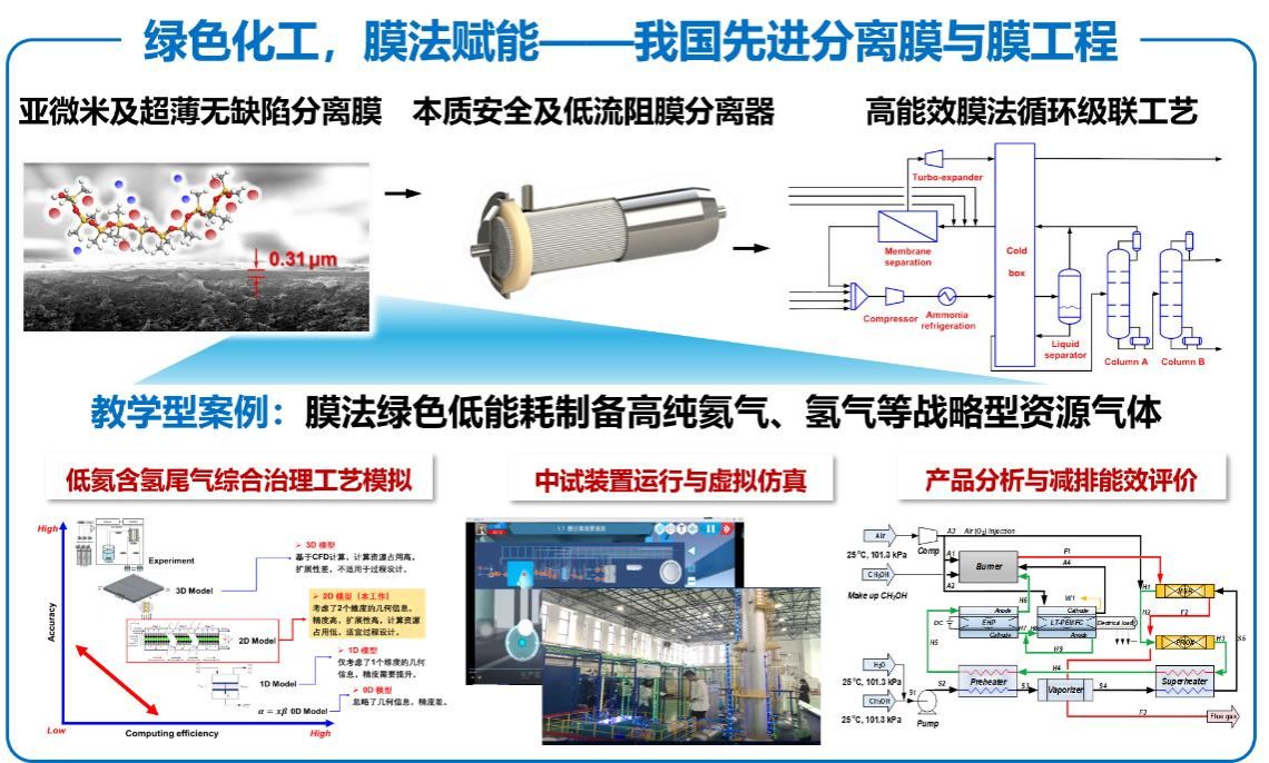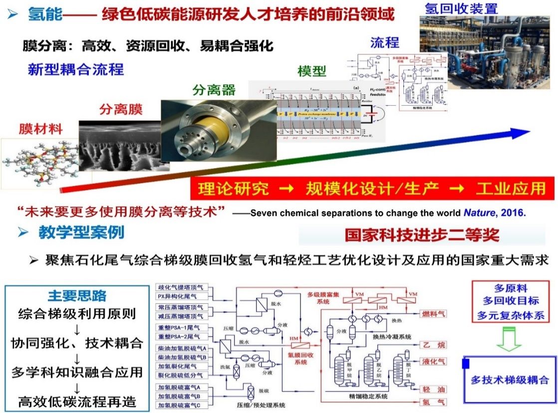 案例简介:氢是一种清洁能源,推动氢商业化应用的关键是低成本制氢。石化行业加氢装置副产大量含氢尾气,对其进行回收利用是现阶段可行有效的低成本制氢方式之一。本案例以培养“低碳清洁能源发展领域具有先进技术和环保意识的工程和创新结合综合高素质人才”为教学目标,探索基于低氢工业废气的膜耦合梯级回收工艺优化设计与工业应用。以获得国家科技进步二等奖的氢气膜回收成果为核心,展示分离领域浓度、压力梯级利用热力学原则,为研究生培养提供低碳案例。本案例属于智慧能源(氢能)领域,面向氢能利用和双碳目标国家重大需求,通过引入膜分离、电化学氢泵、变压吸附等新兴氢气分离技术,聚焦氢气回收的梯级分离先进工艺研究,通过化工流程模拟设计及智能优化,实现流程再造。提出三角坐标-矢量分析法、超结构法等方法,通过多个企业的具体工程案例,阐述石化尾气、焦炉煤气、掺氢天然气等多种不同特点的含氢尾气的提纯工艺设计,并利用神经网络、遗传算法等智能算法,通过过程参数的经济性和低碳性多目标优化,构建绿色低碳循环发展的工艺技术体系。案例面向研究生的核心实践创新能力培养,强调“循环利用、安全持续、低碳减排”的绿色生产要求。