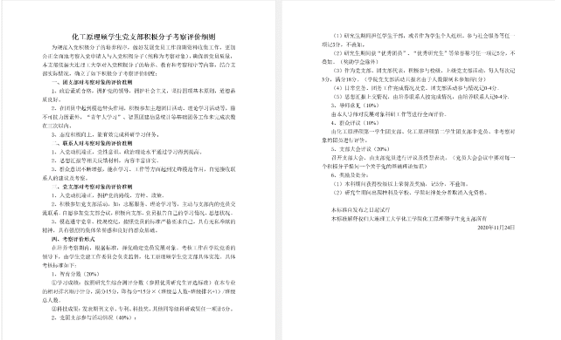 对于积极分子发展本支部制定了详细的考核措施,使得下阶段发展对象的选拔有了依据,也使得支部选拔更加公开透明,特别是在化工原理硕第一学生党支部和化工原理硕第二学生党支部合并后,对积极分子的审查有了统一的标准。