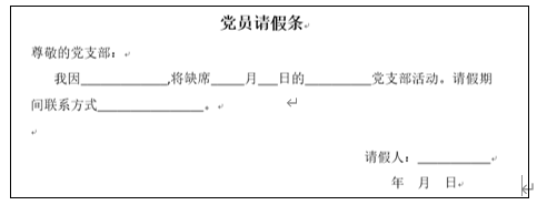 十月份中旬,为保证每次党支部活动的出勤率,支部委员决定进一步完善支部请假制度。党员若因事请假,需向宣传委员提交请假条,并详细说明请假原因,经支部书记同意、备案后,党员可以获得请假批准。