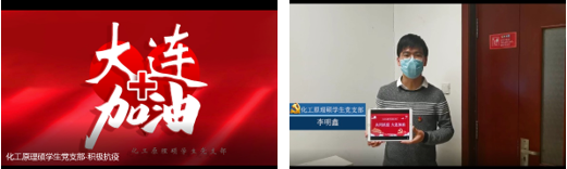 疫情当下的大连,面临着大考,我们身在校园之中组织党员同志 “为大连加油,为中国加油”活动,视频中邢雅枫同志说:“同心战疫,共盼春来,大连加油,中国加油”;积极分子肖倩影表示:“疫情就是命令,防控就是责任,抗击疫情人人有责,抗击疫情我们在一起”。化工原理硕学生党支部一起为大连加油。