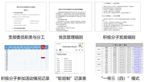 健全支部制度建设 加强党员日常管理。针对过去支部党建中经常出现的支委工作懈怠、党员和积极分子参与积极性不足、出勤率低等问题,支部结合创新立项方案,制定多种管理细则,包括支部委员职责与分工、党员管理细则、积极分子发展细则等,支部工作采用“轮班制”,支部党员积极性的调动采用“一带三(四)”模式,即每位委员分配两到四名普通党员进行日常工作对接和政治生活监督。