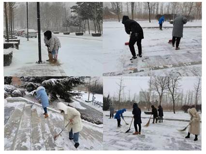 12月30日以来,几场大雪将校园装点得银装素裹、分外美丽,然而伴随着凛冽的寒风,气温骤降,给出行带来诸多不便,为及时清除积雪方便师生出行,支部组织党员和积极分子拿起铁锹和扫帚,冒着零下十几度的严寒,分工合作,互相配合,呈现出一派热火朝天的扫雪除冰场景。