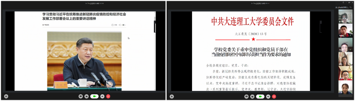 疫情在家期间,支部成员开展线上理论学习,集中学习了习近平总书记在统筹推进新冠肺炎疫情防控和经济社会发展工作部署会议上的重要讲话精神,以及学校党委关于重申党组织和党员干部在当前疫情防控中履职尽责担当作为要求的通知。