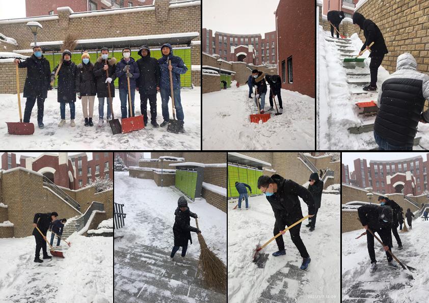 入冬以来,接连大雪,漫天飞舞的飘雪把大工校园装点的分外妖娆,欣赏美景的同时也同样 “美丽动人”,为避免天气降温结冰,影响师生出行安全。支部在校党员和入党积极分子热情高涨,纷纷拿起雪铲和扫帚,团队协作、有序分工,及时清除通往化工实验楼的积雪,开辟出一条人行小道。