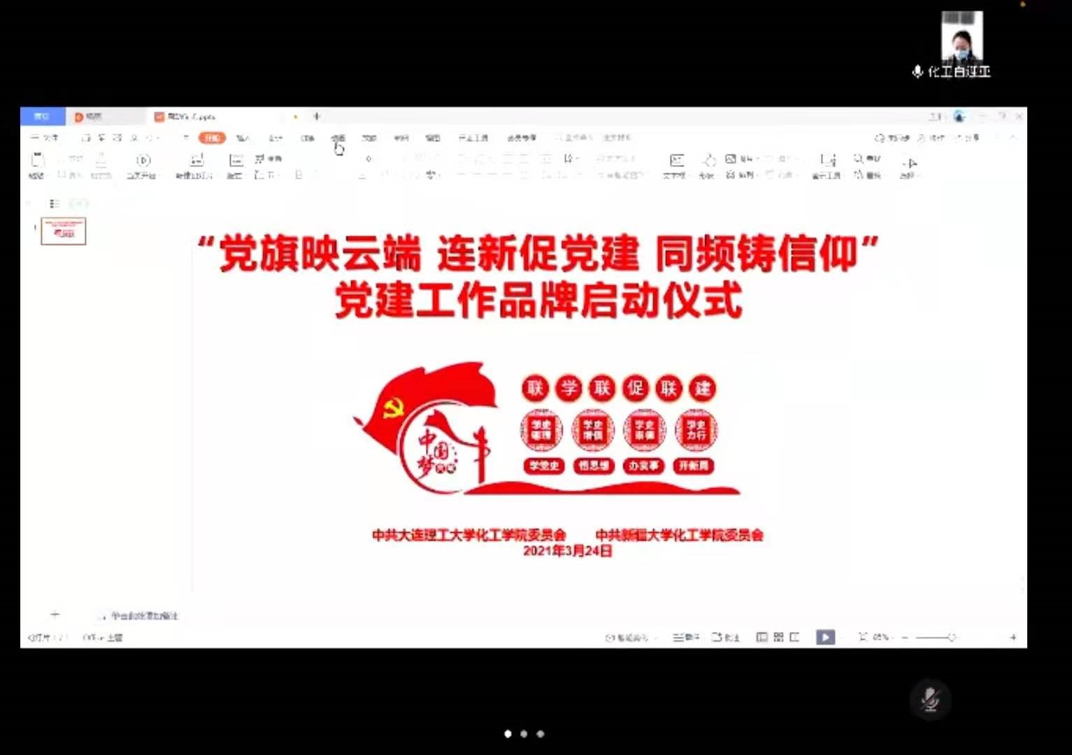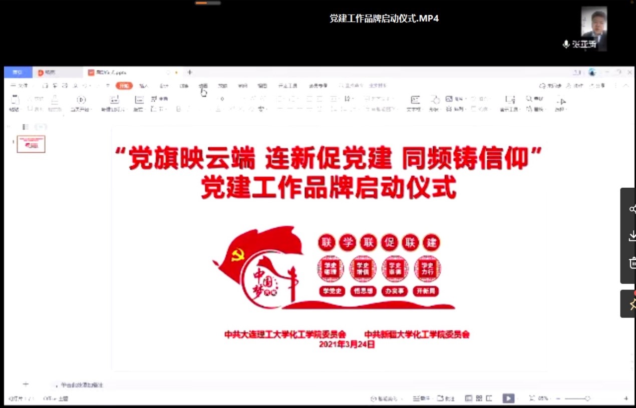 为庆祝中国共产党成立100周年,教育引导广大党员持续深入学习贯彻习近平新时代中国特色社会主义思想,进一步激发党支部和广大学生党员爱党爱国热情,依托对口援建工作,和新疆大学化工学院学生党支部开展党建工作品牌创建。2021年3月24日,大连理工大学化工学院党委联合新疆大学化工学院党委线上举行“党旗映云端,连新促党建,同频铸信仰”党建工作品牌启动仪式,新疆大学化工学院党委书记张亚新教授,党委副书记李育强,大连理工大学化工学院党委书记郭新闻教授,党委副书记兼副院长、纪委书记刘阅、以及联学联促联建党支部书记30余人参加。
