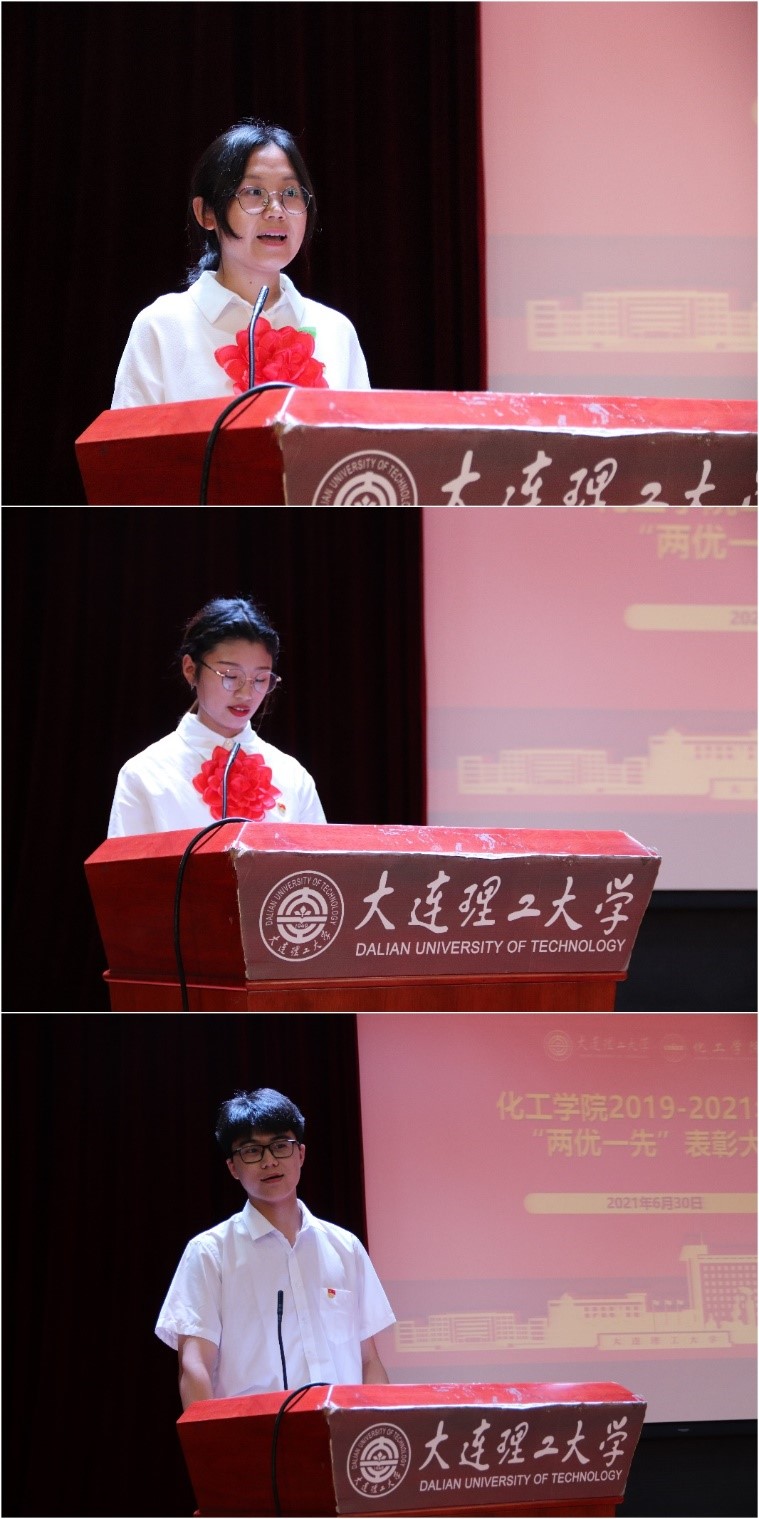 先进基层党组织代表化机系教工党支部书记任婧杰同志,优秀共产党员代表染料与光学信号材料硕党支部书记朱新月同志,及新发展党员代表材料化工系本硕师生纵向党支部于洋同志相继发言,他们分别从不同的角度讲述了个人和所在集体的先进事迹,分享了在党组织的培养和感召下,为党的事业和学院发展不懈努力的奋斗足迹和心路历程,并表示要立足新起点,迈向新征程,实现新目标。