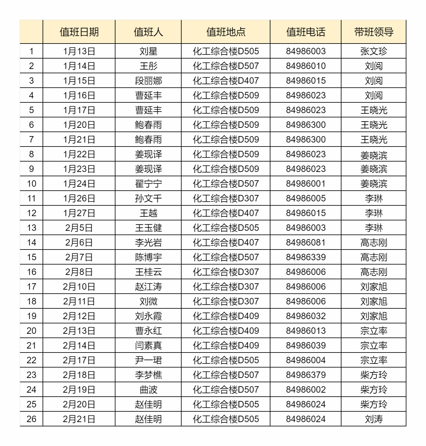 注:会计核算中心化工学院派驻会计寒假期间在主楼值班。