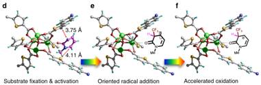 甄选具有光还原能力的有机染料分子三苯胺作为配体母核,通过配体工程在光敏型羧酸配体骨架中插入噻吩基团,显著增强所构筑的金属有机框架MOFs材料在可见光区的吸收;弱化激发态光还原电位,增强基态氧化电位;有机配体π体系增大导致配体间芳香堆积,造成金属节点配位扭曲,引入配位不饱和位点,“锚定”底物分子、拉近芳香底物代谢活性位点与光催化中心距离,进而在金属有机框架MOFs孔道微环境中改变反应动力学决速步骤,实现了远优于现有均相体系的区位和非对映立体选择性,并成功应用于具有生物活性的精细化工中间体和药物分子代谢活性位点的高选择性保护。金属有机框架MOFs作为晶态材料,其空间结构长程有序性和孔道内部丰富的弱作用位点能够“约束”底物和中间体,易得到均相溶液条件下难以形成的特定构型和构象,不仅可用于调控反应区位和立体选择性,也可通过X射线单晶衍射直接观测,有助于深入理解金属有机框架限域光催化的构效关系,揭示其独特魅力与优势。相关工作由张铁欣博士与本团队学生郭向阳、史雨生完成,近期发表在Nature Communications, 2018, 9, 4024. (IF: 13.691, JCR一区) 通讯作者为段春迎教授。