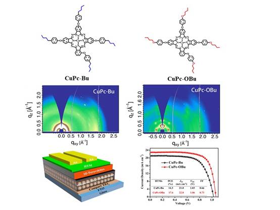 于泽副研究员在前期工作的基础上(ChemSusChem2017, 10, 1838–1845;J. Mater. Chem. A 2017, 5, 17862–17866),进一步通过分子修饰酞菁铜的结构,制备了酞菁铜衍生物CuPc-Bu和CuPc-OBu(如图)。虽然这两个酞菁铜衍生物在结构上非常相似,但它们的化学性质表现出很大的差异。CuPc-OBu的空穴迁移率为4.30 × 10‒4 cm2∙V‒1∙S‒1,大大优于CuPc-Bu(1.23 × 10‒4 cm2∙V‒1∙S‒1)。通过掠入射广角X射线散射(GIWAXS)测试发现,CuPc-OBu具有较好的结晶性和较强的π-π相互作用。相比之下,CuPc-Bu呈现出edge-on的堆积方式,因此不利于垂直方向载流子的传输,导致空穴迁移率比较低。采用非掺杂的CuPu-OBu作为空穴传输材料的钙钛矿太阳能电池最优取得了17.6%的光电转换效率,远远高于CuPc-Bu(14.3%)。同时,CuPc-OBu表现出优异的疏水性能(接触角,106.5°),因此可以有效地阻止水分子对钙钛矿的破坏。和三维/二维钙钛矿吸光层相结合,采用CuPc-OBu的钙钛矿太阳能电池表现出良好的长时间空气稳定性。未封装器件在室温85%高湿度的条件下运行120小时,仍然保持84%的初始效率。同等条件下,采用掺杂添加剂的Spiro-OMeTAD的器件效率快速衰减,仅仅维持了21%的初始效率。该工作为设计低成本、高性能以及高稳定性的钙钛矿太阳能电池空穴传输材料提供了新的思路。