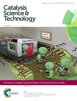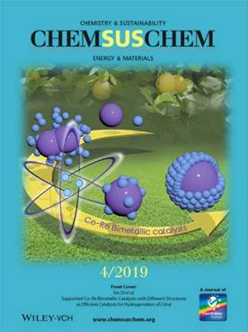 近日,梁长海教授与法国普瓦捷大学Gwendoline Lafaye教授等合作,首次研究了由催化剂结构引起的Co-Re相互作用在不饱和醛加氢反应中的催化机理。团队成员采用不同的制备方法得到了一系列具有不同接触界面结构的Co-Re双金属催化剂(Isolated结构、Janus-Type结构以及Core(Co)-Shell(Re)结构)。研究表明,随着活性金属接触度的增加,催化剂相互作用增强,有效促进Re前体的还原。DOS计算结果证实低价态的Re组分更有利于加氢中间物的吸附。此外,低价态活性金属相也会增强活性位的氢活化能力,进一步提高催化剂的柠檬醛加氢反应性能。同时,金属间相互作用可以促进电子由Re向Co偏移,有利于柠檬醛中富电子醛基官能团在Re组分表面的吸附。基于以上不同作用机理,具有Janus-Type结构以及Core-Shell结构催化剂的反应活性显著高于单金属和具有Isolated结构的双金属催化剂;然而Co-Re相互作用的形成造成金属间过度接触,会在一定程度上抑制柠檬醛加氢反应,动力学分析拟合结果进一步证明了该观点。相关结果发表在ChemSusChem(2019, 12, 807-823)上,并被选为封面论文介绍。ChemSusChem是国际化学领域最具权威和最有影响力的学术期刊之一,2018年影响因子高达7.411.
