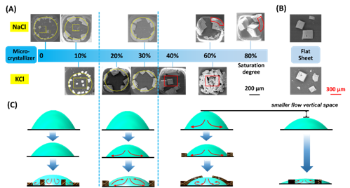 图2:不同浓度条件下晶体“咖啡环”形成(A:3D打印微尺度结晶器;B:传统结晶平台)及微液滴内环流影响机理分析(C)。