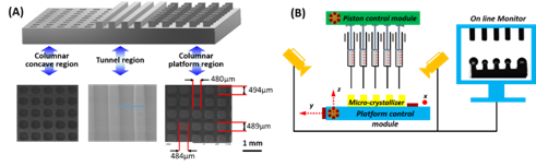 图1:(A)3D打印加工的微结晶器(B)以微结晶器为核心的液滴滴加系统。