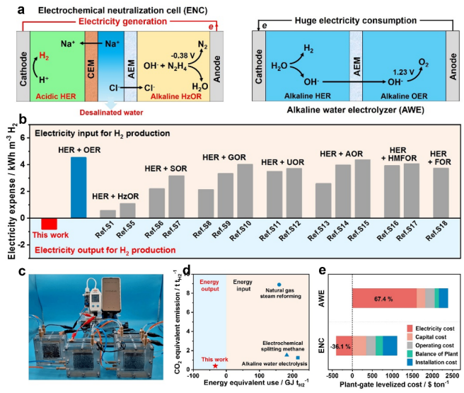 图1(a)电化学中和能电池的构造示意图;(b)电化学中和能电池与常规电解水技术的制氢能耗比较;(c)电化学中和能电池为智能手机充电;(d) 电化学中和能电池技术与传统技术的制氢能耗与碳排放比较;(e)本技术的基础技术经济分析。