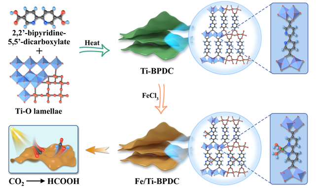 图1.具有原子分散Fe位点的二维Fe/Ti-BPDC光催化剂的合成示意图