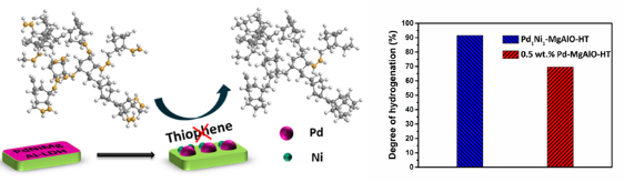该工作利用离子交换技术控制前驱体中Pd、Ni含量,经拓扑结构转变获得具有高结构稳定性的双金属催化剂,通过将两种高效树脂加氢催化剂相结合,显著地提高了催化剂活性,Pd1Ni1-MgAlO-HT在温度210oC、5MPa H2的条件下反应3h即可获得加氢饱和度高达94.4%的氢化石油树脂。此外,Pd-Ni之间的电子转移效应降低了毒物与活性位点的结合能,相较于单金属Pd催化剂而言,Pd1Ni1-MgAlO-HT在含硫条件下的加氢活性显著提高。