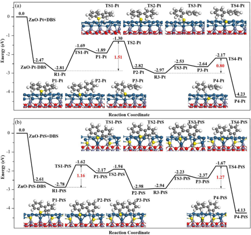 该研究工作主要从Pt/ZnO反应吸附剂中金属活性中心的吸附方式、空间位阻对二苯并噻吩类化合物的脱硫效率、Pt/ZnO在脱硫过程中的结构演变、活性中心上的硫沉积/吸附等方面进行研究。研究结果表明,采用Pt中心,二苯并噻吩的吸附构型发生转变,以σ型优先吸附于Pt中心表面,与Ni和Pd中心的π型吸附截然不同。这也是导致1Pt/ZnO的超高脱硫活性的主要原因,其TOF可达84.8h-1,脱硫比速率为3.51 μmolDBT/(g·min)。二苯并噻吩在Pt/ZnO上的脱硫活性与Pt与ZnO间的协同作用相关;当反应物中存在空间位阻时,4,6-二甲基二苯并噻吩的本征脱硫活性与Pt的分散度呈正相关。同时,对反应过程中Pt和ZnO的结构演变进行验证,Pt在常压反应吸附脱硫过程中形成PtSx活性组分,ZnO载体因其特殊的S转移性质可有效保护PtSx活性中心在反应吸附脱硫阶段保持高分散性及活性,无明显硫中毒现象。Pt/ZnO在达到饱和硫容后,可以在高压条件下实现高的加氢脱硫稳定性。研究过程同时采用DFT和实验结果对比证实,相比于Pt和PtZn,PtSx作为Pt/ZnO的活性中心,有效降低反应能垒,精准实现常压直接脱硫过程。