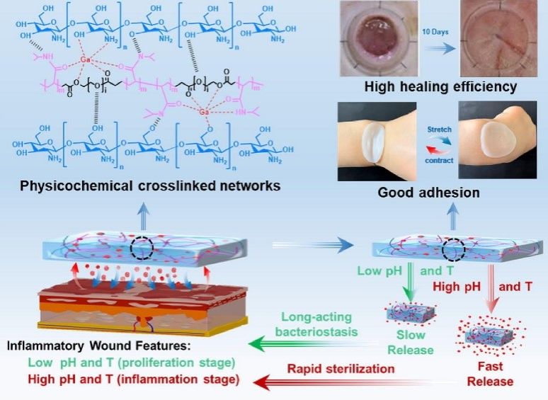 近日,大连理工大学高效分离膜与膜工程团队联合大连理工大学附属中心医院成功开发了一种具有温度/pH双响应型且可负载抗菌抗炎Ga3+的多功能水凝胶敷料,其中,Ga3+主要通过螯合作用存在于水凝胶敷料分子网络内部。由于交联互穿网络的存在,制备的水凝胶敷料具有大面积塑性、中等机械弹性、良好的皮肤粘附性和剥离性,以及优异的热稳定性。Ga3+的存在使水凝胶敷料具有抗菌和抗炎的性能,提高了其机械性能和热稳定性;温敏性基团和壳聚糖单体的存在赋予该智能水凝胶敷料温度和pH响应特性,可以灵敏地实现高温或碱性条件下Ga3+快速释放,低温或酸性条件下镓离子缓慢释放的效果(图1)。