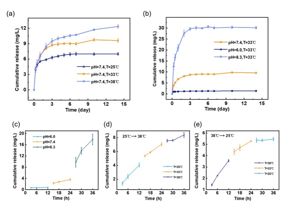 图2 Ga3+在不同温度和pH下的响应性释放测试