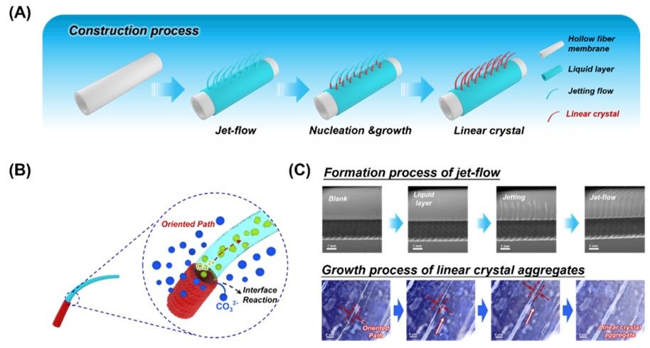 图1 膜界面重构的喷射流限域结晶制备晶体聚集体(A)由喷射流构建线状晶体聚集体的过程示意图(B)柱状喷射流界面限域结晶机理图(C)喷射流的形成过程和晶体聚集体的生长过程