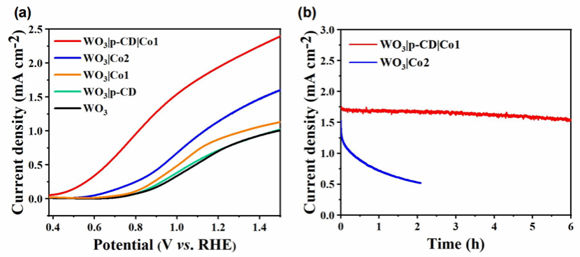图2 杂化光阳极的PEC性能。(a)WO3、WO3|p-CD、WO3|Co2、WO3|Co1和WO3|p-CD|Co1的J-V曲线;(b)在1.23 V vs. RHE的恒定电位下,WO3|p-CD|Co1和WO3|Co2连续工作6小时的光电流。