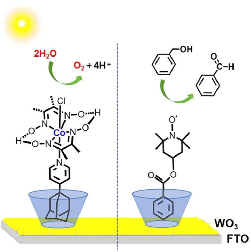 在太阳能分解水器件中,分子催化剂与可见光吸收半导体相耦合的复合体系兼具前者的高催化活性与后者的光稳定性优势,因此具有广阔的应用前景。然而,通过何种方式合理地构建杂合体系仍然是人工光合作用所面临的挑战之一。基于以上背景,大连理工大学精细化工国家重点实验室李斐教授创新性地将主-客体自组装策略用于构建高性能复合光阳极。该策略利用多个膦酸基团修饰的环糊精(p-CDs)作为主体分子,通过化学吸附稳定地负载于WO3半导体光阳极薄膜的表面。同时,修饰有疏水基团的分子催化剂作为客体分子,能够自发地进入p-CDs的空腔,形成WO3|p-CD|catalyst杂合电极,用于光电催化水氧化以及有机底物的氧化(图1)。
