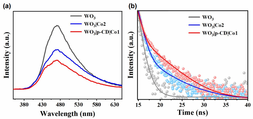 图3 杂化光阳极的荧光光谱。(a)WO3、WO3|Co2和WO3|p-CD|Co1光阳极的稳态荧光发射光谱。(b)WO3、WO3|Co2和WO3|p-CD|Co1光阳极的时间分辨荧光光谱。激发波长为375 nm,监测460 nm处的荧光衰减。