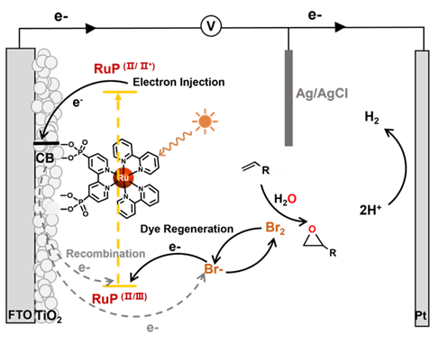 利用光电化学池分解水是实现人工光合作用的重要途径,然而光阳极上进行的水氧化反应面临诸多挑战,如高热力学能量需求和动力学缓慢等。尽管目前已经开发了诸多策略,但光阳极的效率仍未达到实际应用的需求。作为太阳能清洁转换的新途径,光阳极上的水氧化反应理论上可以用能量需求较低的有机底物氧化反应替代,实现高附加值化学品的制备与光阴极制氢相结合。近期,大连理工大学精细化工国家重点实验室李斐教授构建了一种钌基染料敏化光阳极,以LiBr为电子传输中介,以水为氧源,实现了对烯烃的高效高选择性光电催化环氧化。
