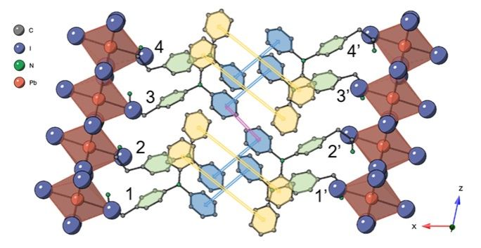 在(DPA-PEA)2PbI4二维钙钛矿晶体中,由于三苯胺基团特殊的螺旋桨式结构,p-p相互作用广泛存在于1-1',2-2',3-3'和4-4'之间标记为蓝色的苯环对,以及3-2'之间标记为蓝色的苯环对。理论计算结果表明相邻层DPA-PEA+阳离子之间的结合能和空穴转移积分均大于PEA+阳离子对。