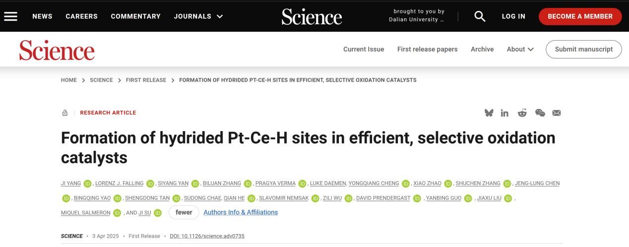 近日,大连理工大学化工学院刘家旭教授团队与劳伦斯伯克利国家实验室Ji Su研究员、Miquel Salmeron教授、David Prendergast研究员课题组及华中师范大学郭彦炳教授课题组合作在负载型催化剂研制方面取得突破性进展,研究成果“Pt-Ce催化剂中氢化位点的形成驱动高效选择性氧化”(Formation of hydrided Pt-Ce-H sites in efficient, selective oxidation catalysts)在《科学》(Science)上发表。该研究表明在设计高效负载型催化剂时,需要精确构建金属与载体之间的界面结构,并充分利用氢在催化过程中的独特作用。刘家旭教授为通讯作者之一,团队科研助理闫思杨工程师为共同第一作者。