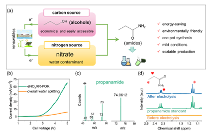 该研究建立了通过阴极硝酸盐还原和阳极醇氧化反应协同耦合合成丙酰胺的新路线。通过调节反应条件,在流动电池中常温常压可克级规模合成丙酰胺。基于对比实验、原位红外分析和理论计算,提出了反应机制,即关键反应中间体是阴极生成的羟胺和阳极生成的丙醛,二者在阴极进一步反应合成丙酰胺。这项工作为电化学C-N键偶联绿色合成高值化学品提供了新方法。研究工作得到了国家自然科学基金联合基金重点项目和中央高校基本科研业务费专项资金支持。