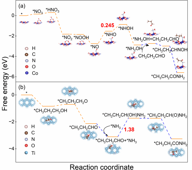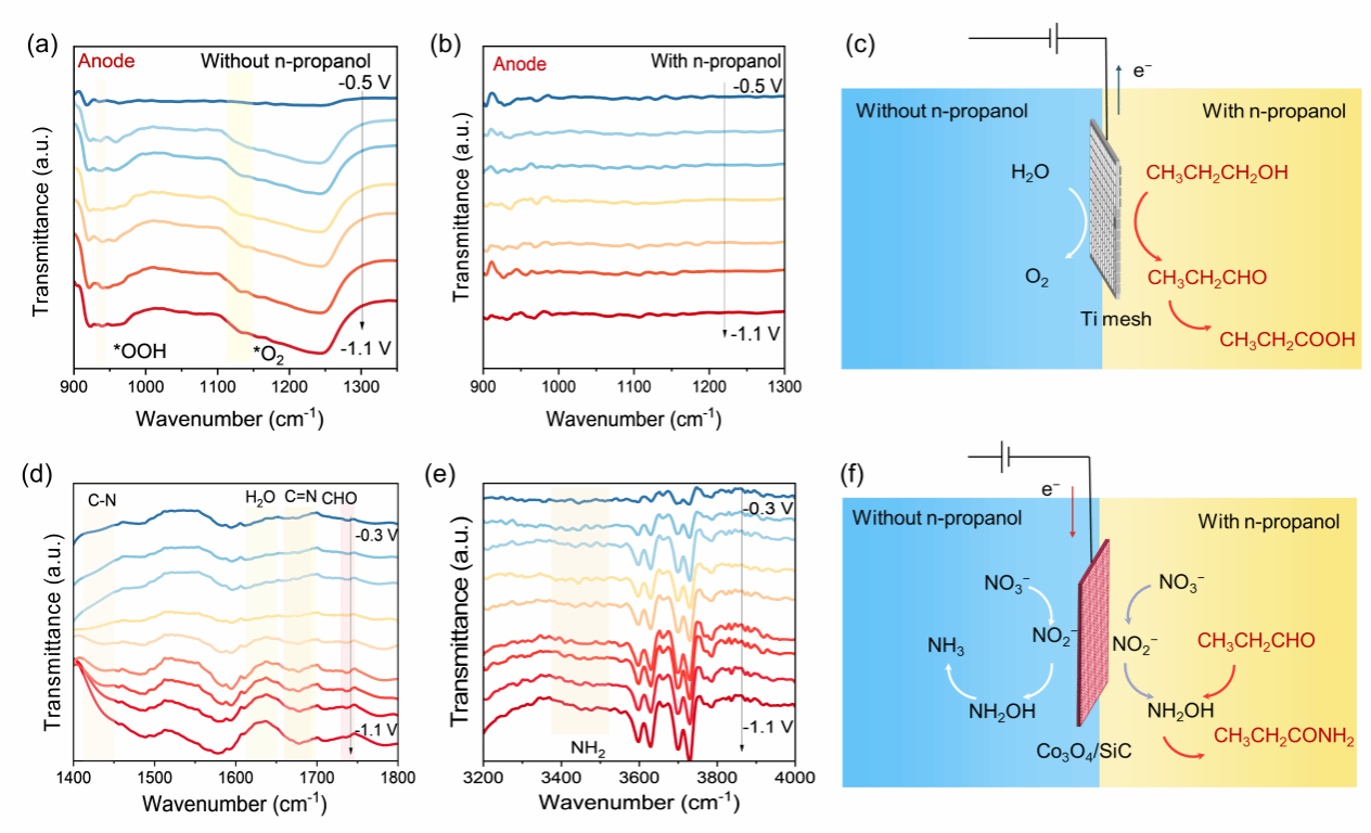 通过对比实验与原位红外光谱表征,对反应机理进行了深入分析。研究发现,在阴极生成的NH2OH中间体可与阳极生成的丙醛中间体发生反应,在阴极催化剂表面生成丙酰胺。此外,在阳极侧,丙醛还可与阴极生成的氨进一步反应生成丙酰胺。