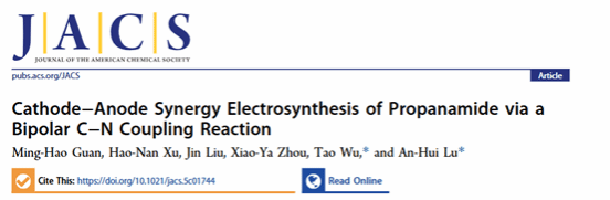 近日,化工学院陆安慧教授团队采用电化学法合成酰胺领域取得新进展,采用电化学阴阳双极协同方法,以硝酸盐和正丙醇为反应物,在温和条件下反应高效合成酰胺。相关成果以“阴阳双极协同C-N偶联电合成丙酰胺”“Cathode-Anode Synergy Electrosynthesis of Propanamide via a Bipolar C-N Coupling Reaction”为题发表在《美国化学会志》(Journal of the American Chemical Society)上。该论文第一作者为关铭昊博士生,通讯作者为陆安慧教授和吴涛副研究员。