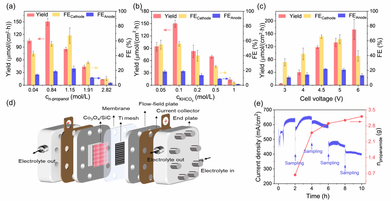 采用Co3O4/SiC催化剂作为阴极,可高效催化硝酸盐还原反应;同时以Ti网催化剂作为阳极,实现醇高效的电化学氧化。实验结果表明,阴阳两极均展现出优异的催化性能。此外,该耦合体系表现出较高的反应活性,并通过多种分析手段确认了生成产物丙酰胺。
