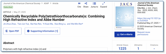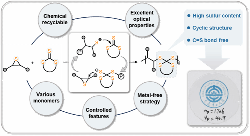 该工作提出了通过环硫烷烃与环状全硫代碳酸酯的交替共聚制备聚四硫代原碳酸酯的策略。所制备的聚合物官能团具有高的含硫量、无碳硫双键的共轭以及脂肪环结构的特点,使得该聚合物表现出高的折射率、高的阿贝数以及无色高透光等优异光学特性。此外,该共聚物可以通过简单的热解以高纯度和高收率回收相应的起始单体。该工作为高折射率以及高阿贝数的聚合物材料的创制提供了一种有效的策略。该研究工作得到了国家自然科学基金,国家重点研发计划以及教育部智能材料化工前沿科学中心的资金支持的支持。