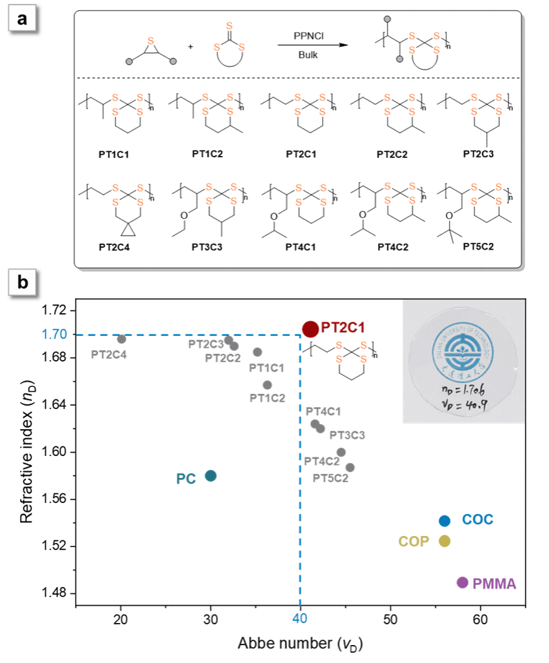 具有高折射率(nD)和高阿贝数(vD)的聚合物材料在高端光学器件领域具有重要的应用价值。将硫原子引入聚合物可以显著提高聚合物的折射率。然而,光的折射和色散之间存在的固有平衡使得高折射率的聚合物通常具有低的阿贝数。此外,引入过多的硫原子会使聚合物材料呈现较深的颜色并降低其透光性。因此,合成具有高折射、高阿贝数以及高透光性的高分子材料充满挑战。本研究通过调节官能团中的硫原子分布,破坏硫原子之间的共轭来消除颜色;通过引入能降低色散的脂肪环结构,创制了具有全新富硫官能团的聚四硫代原碳酸酯,在保持高折射率的同时提升了阿贝数,实现了对传统光学性能瓶颈的突破。