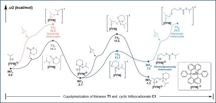 DFT计算辅助验证了反应的机理以及其高的化学选择性。计算结果显示,在交替共聚的过程中,环硫丙烷的开环能垒最高,达到了17.9 kcal/mol。表明环氧烷烃的开环过程是共聚反应的决速步骤。此外,环硫烷烃的均聚以及共聚生成聚(硫醚-硫代碳酸酯)反应的活化能分别为22.6和26.9 kcal/mol,均高于生成聚四硫代原碳酸酯反应的活化能。计算结果证明了生成聚四硫代原碳酸酯的过程是动力学有利的。特别地,聚四硫代原碳酸酯与起始两个单体的能量差只有–1.5 kcal/mol。接近热力学平衡的状态说明聚四硫代原碳酸酯具有解聚到起始单体的潜力。