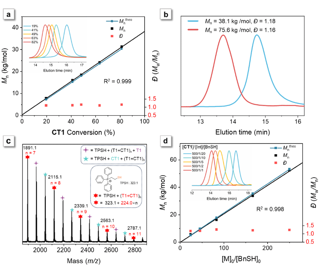 团队使用有机盐引发体系成功实现了环硫烷烃与环状三硫代碳酸酯的交替共聚。在PPNCl(双三苯基膦基氯化铵)的引发下,环硫烷烃可以和环状三硫代碳酸酯可以高效聚合。利用核磁共振以及质谱等仪器对共聚物结构进行表征,结果显示所得共聚物为聚四硫代原碳酸酯(选择性>99%)。详细地聚合反应历程研究显示,聚合物的分子量随着共聚反应中单体的转化率呈线性增加,且分子量分布较窄。这些结果表明有机铵盐引发的环硫烷烃与全硫代环状碳酸酯的交替共聚反应具有良好的可控性能。此外,该共聚反应可以发生链转移反应,为这类材料的功能化应用提供了基础。