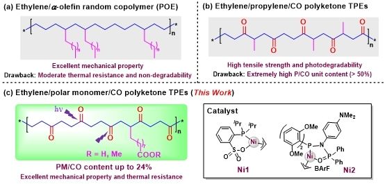 传统的聚烯烃弹性体(POE)性能优异,广泛应用于汽车、电缆、医疗和包装等领域,但其碳-碳键结构稳定,难以自然降解,导致“白色污染”,且耐热温度较低(通常低于104 °C),限制了高温应用。脂肪族聚酮材料具有高耐热性、优异的机械性能以及独特的光降解特性,被视为一种极具潜力的替代材料。然而,其作为弹性体的开发仍面临两大关键挑战:一是CO与α-烯烃单体易对金属催化剂产生“双重毒化”效应,严重制约聚合效率;二是传统聚酮分子链规整性强、结晶度高,要实现弹性需依赖高α-烯烃插入量,合成难度大。针对上述挑战,团队采用生物基单体与镍催化剂协同的策略,即利用单体分子中固有的长亚甲基链段作为柔性单元,通过将其引入聚酮主链,有效削弱主链间强偶极相互作用,从而实现了材料从塑性到弹性的可控转变。这一方法为开发兼具高性能与可降解特性的热塑性弹性体提供了有效的新途径。