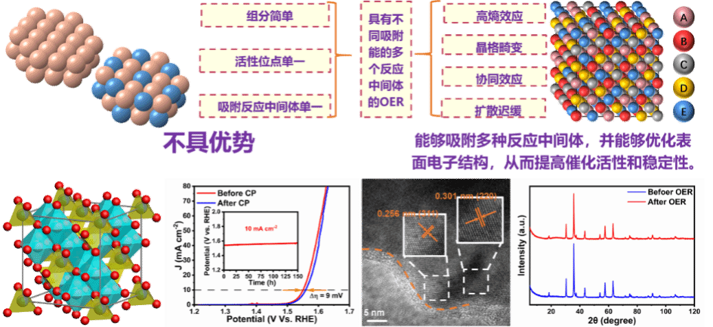 在电解水制氢方面,博士生沈伟林等创新性地将高熵理念融入尖晶石氧化物,成功制备出具有尖晶石结构的高熵氧化物(Fe0.2Co0.2Ni0.2Mn0.2Zn0.2)3O4。该催化剂在仅2 mg cm-2的低载量下表现出优异的析氧反应(OER)性能:过电位(η10)低至313 mV,Tafel斜率为59.7 mV dec-1,并在150小时恒电流测试后过电位仅增加9 mV,展现出卓越的稳定性。机理研究表明,该材料在反应中遵循晶格氧机制(LOM),表面重构为五金属共羟基氧化物(FeCoNiMnZnOOH),作为直接活性位点参与反应,而体相仍保持稳定的高熵尖晶石结构,实现了高活性与高耐久性的统一。
