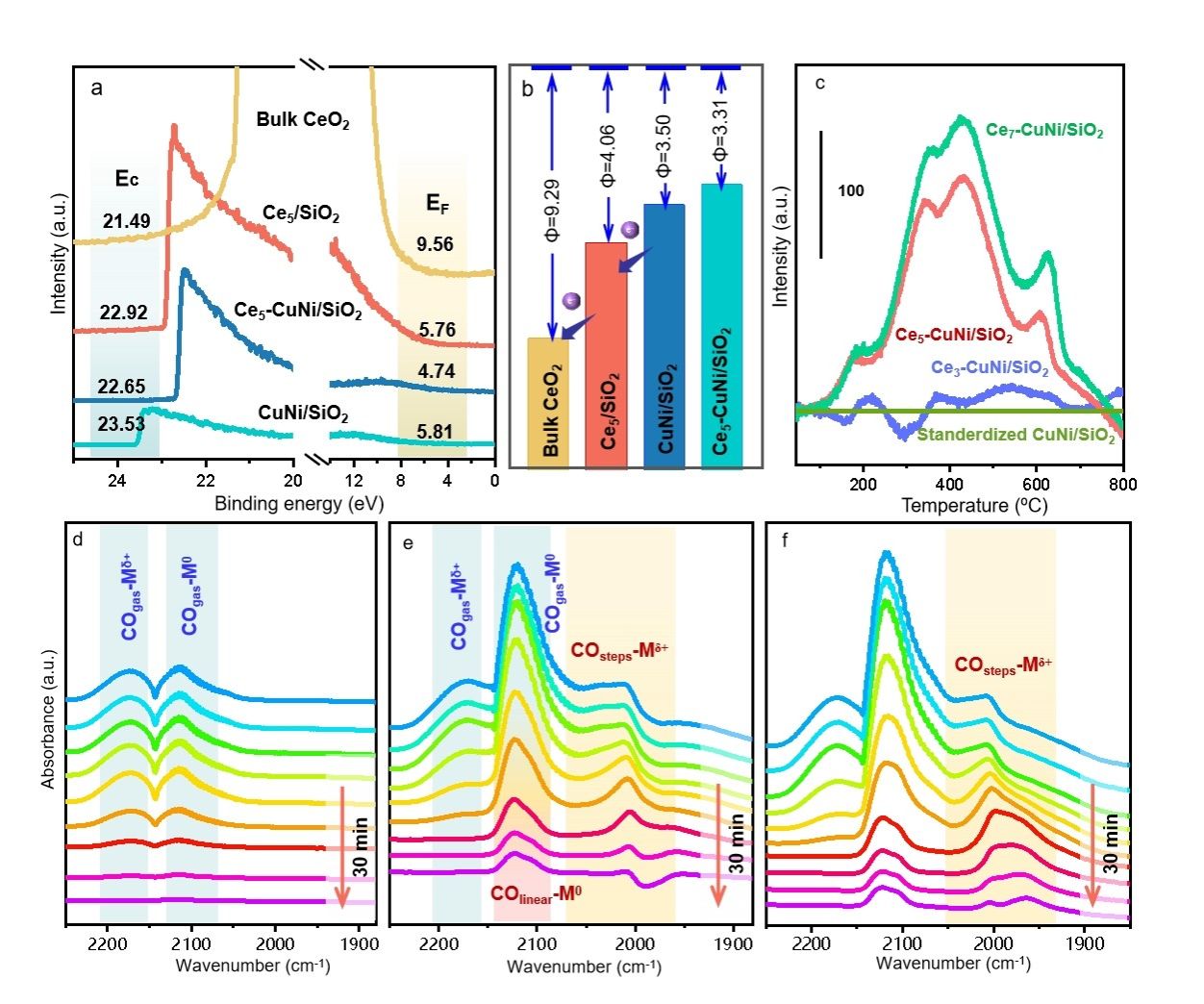 图2. Cen-CuNi/SiO2的功函数、H2-TPD及化学环境进一步验证