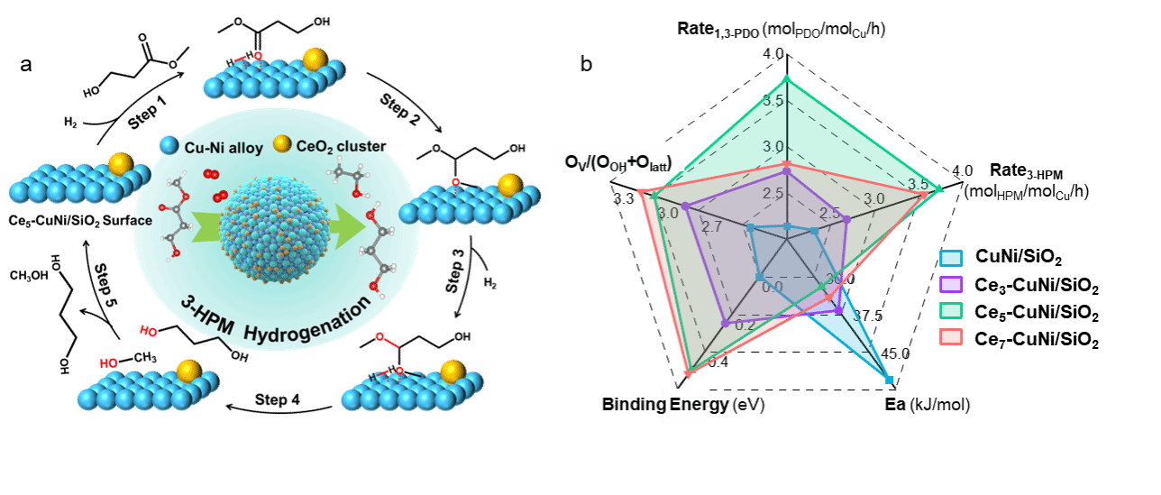 1,3-丙二醇 (1,3-PDO) 是新型聚酯材料-聚对苯二甲酸丙二醇酯 (PTT) 的关键单体。近日,大连理工大学梁长海教授团队针对3-羟基丙酸甲酯 (3-HPM) 制1,3-PDO过程中催化剂易失活、脱水产物难抑制、3-HPM转化不足等问题,提出了金属活性中心的“局域电子调控”理论。研究工作在CuNi合金颗粒表面定向构建配位不饱和的CeO2团簇,在保持活性中心的金属态及活化解离H2能力的前提下,精准优化金属Cu中心的电子环境,在超快反应速率下实现1,3-PDO高达97%的收率,并首次验证了3-HPM的非解离型吸附反应机理。
