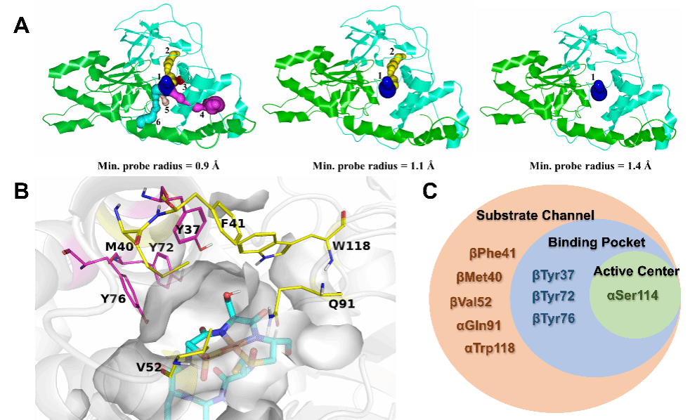 再通过对比酶突变前后底物通道的构象变化、结合口袋的体积变化,分子对接与分子动力学模拟对于酶与底物(包括ADN与5-CVAM)之间相互作用的计算分析,详细讨论了两种突变体是如何通过影响酶自身结构以及与底物之间的相互作用,实现了对5-CVAM区域选择性的提升。
