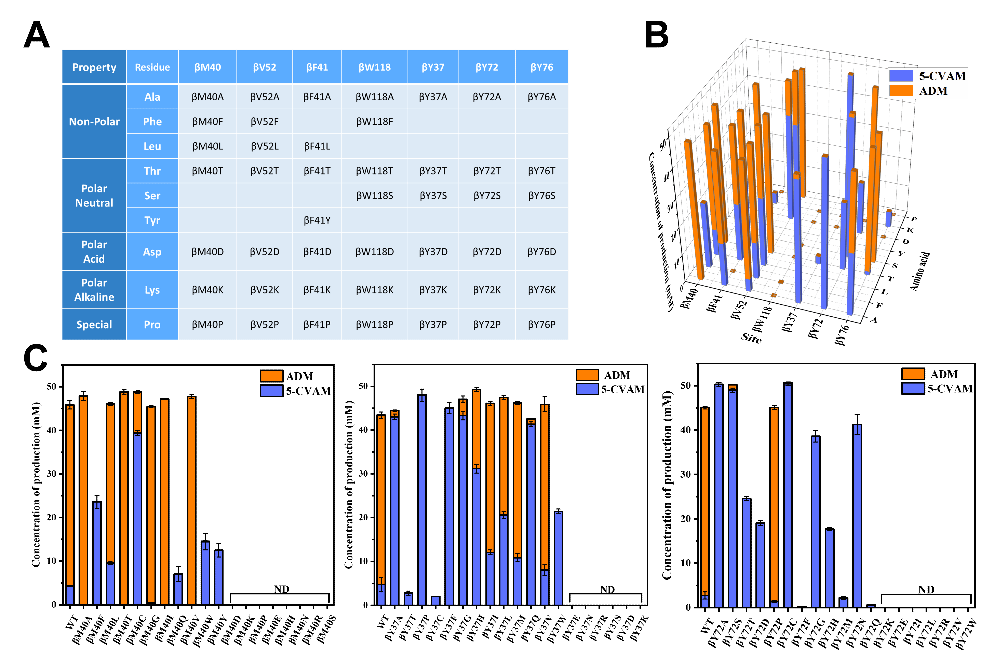 针对上述问题,研究团队提出了基于半理性设计的酶工程化改造策略,实现对ReNHase区域选择性进行调控。基于半理性设计预测并得到了位于ReNHase底物通道和结合口袋的重要残基,在剔除高度保守和影响酶活性的残基位点后建立了突变体文库。进行筛选并进行酶动力学参数表征后,锁定了能够调控催化ADN反应产物区域选择性的关键位点βTyr72,并且得到了对于5-CVAM区域选择性分别为96%和100%的突变体βY72A和βY72C。
